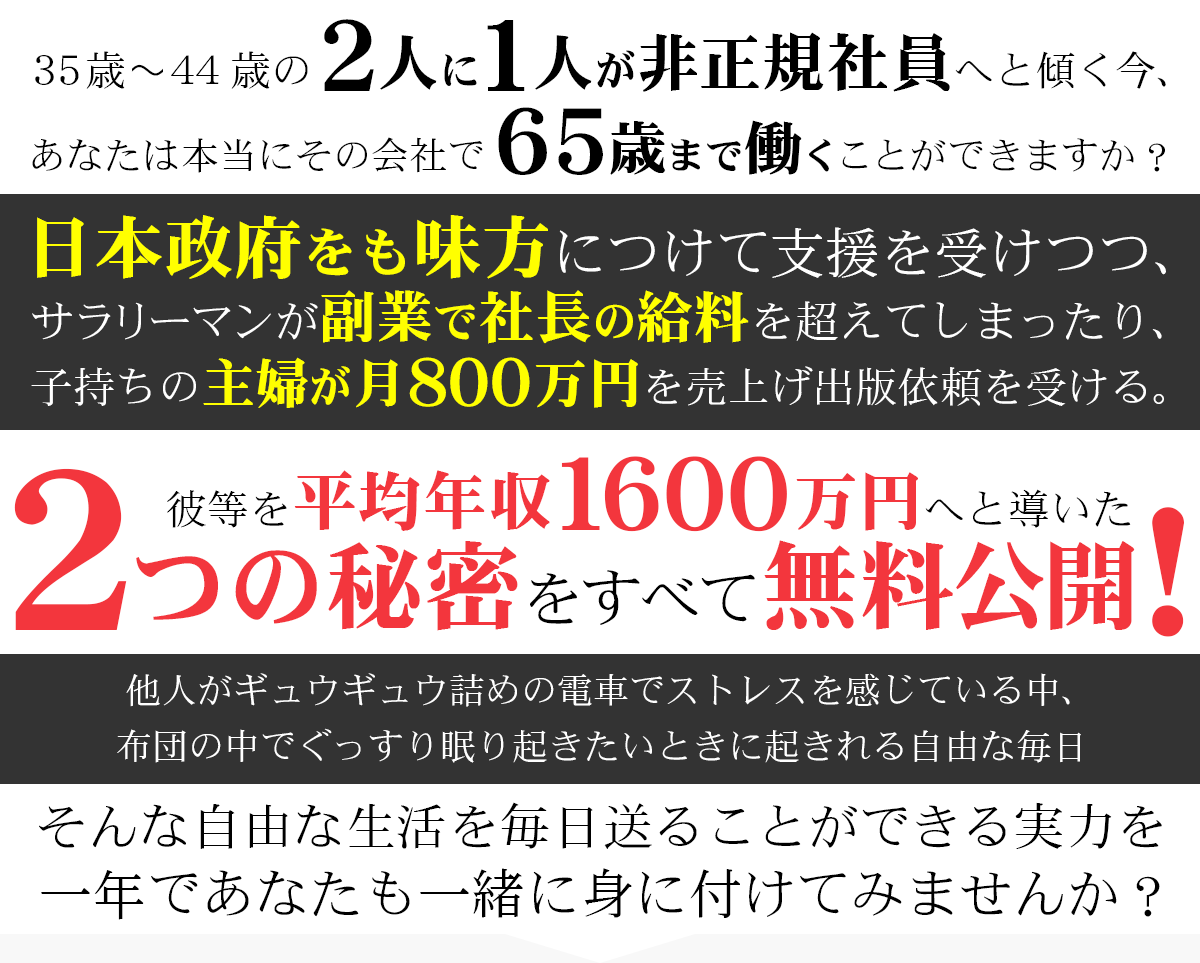 このページの最後には、全員の平均年収を1年で1600万円まで引き上げたノウハウを受け取る方法が書いてあります。 ※今だけ初回公開につき無料です。
